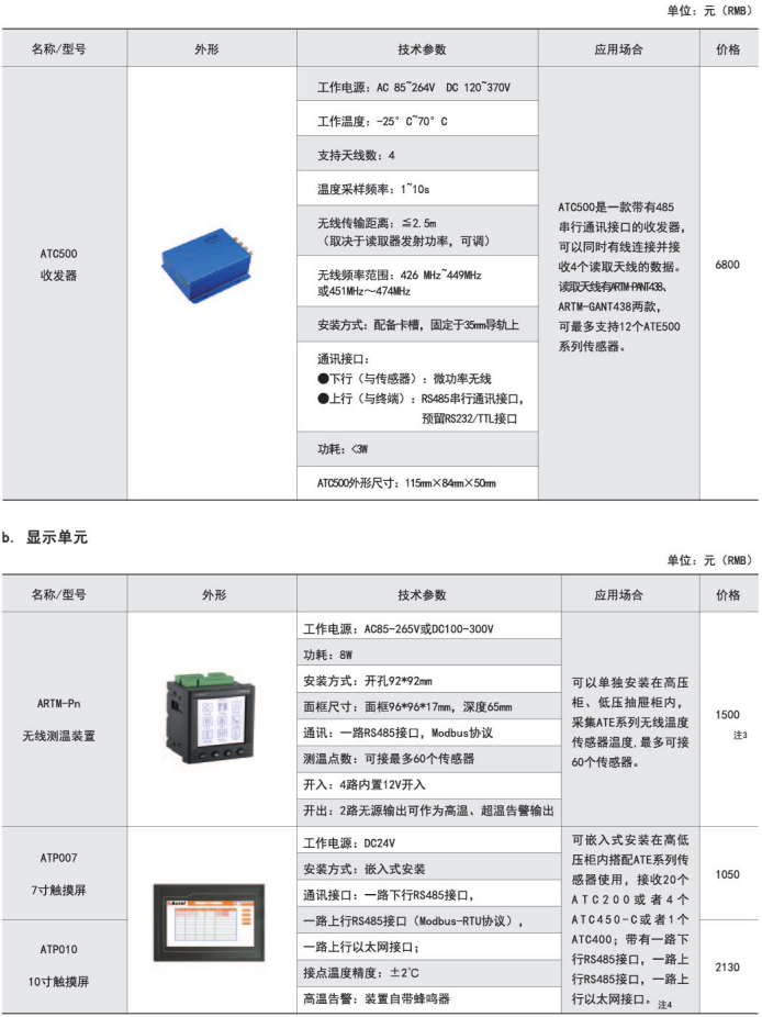 ARTM-Pn無線測溫裝置:ARTM-Pn無線測溫裝置可以單獨安裝在高壓柜、低壓抽屜柜內,每臺裝置可以接收18個傳感器的數據,傳感器型號可選配ATE100、ATE200、ATE300。裝置帶有一路485接口,可將采集到的溫度數據上傳到監控中心。