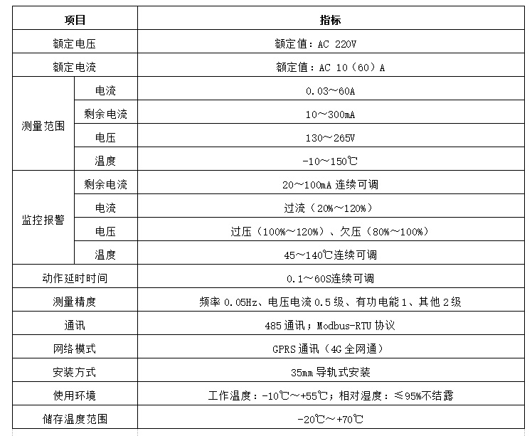 實時監測一路剩余電流、兩路溫度、電流、電壓、功率、電能等電參量,RS485通訊,GPRS無線通訊,帶開合閘控制功能
