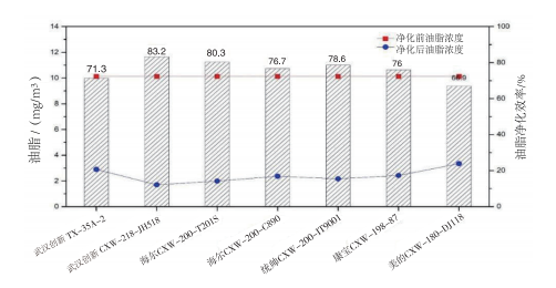 從圖5和圖6可以看出,兩種工況下所測得的油脂凈化效率一致性較好,而顆粒物凈化效率的數(shù)據(jù)存在一定程度的偏差。對實(shí)驗(yàn)過程進(jìn)行分析可知,實(shí)際烹飪菜品所排固態(tài)污染物中,除油脂小液滴以外,有相當(dāng)一部分是食物中有機(jī)質(zhì)熱氧化或熱裂解產(chǎn)生的固態(tài)顆粒物;而水滴油實(shí)驗(yàn)所排固態(tài)物中主要為油脂小液滴,其它顆粒物所占比重很小。因此,在油煙中油脂含量較高的情況下,采用紅外紅外分光光度法測得的實(shí)驗(yàn)數(shù)據(jù)在理論上要比稱重法測得的數(shù)據(jù)相對更為可靠。因此,在對水滴油實(shí)驗(yàn)和實(shí)際烹飪菜品兩種工況所測數(shù)據(jù)進(jìn)行比較時(shí),以油脂凈化效率表征的固態(tài)污染物凈化效果顯示出更好的一致性。通過以上結(jié)論,在制定《家用吸油煙機(jī)污染物排放標(biāo)準(zhǔn)》時(shí)可以考慮將水滴油實(shí)驗(yàn)方法作為標(biāo)準(zhǔn)方法,對吸油煙機(jī)固態(tài)污染物凈化效率進(jìn)行測試。
