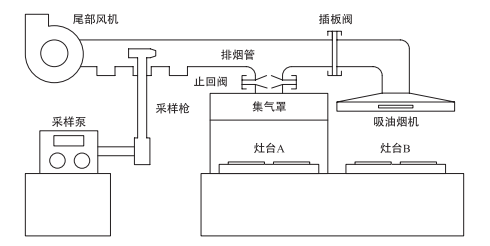 測試平臺由兩個(gè)灶臺組成,如圖1所示,其中一個(gè)灶臺安裝集氣罩收集并排放油煙,另一個(gè)灶臺安裝吸油煙機(jī)收集油煙。安裝集氣罩的灶臺用于測定家庭烹飪油煙中污染物的原始排放濃度,安裝吸油煙機(jī)的灶臺用于測定經(jīng)過吸油煙機(jī)處理后的烹飪油煙中污染物的排放濃度。