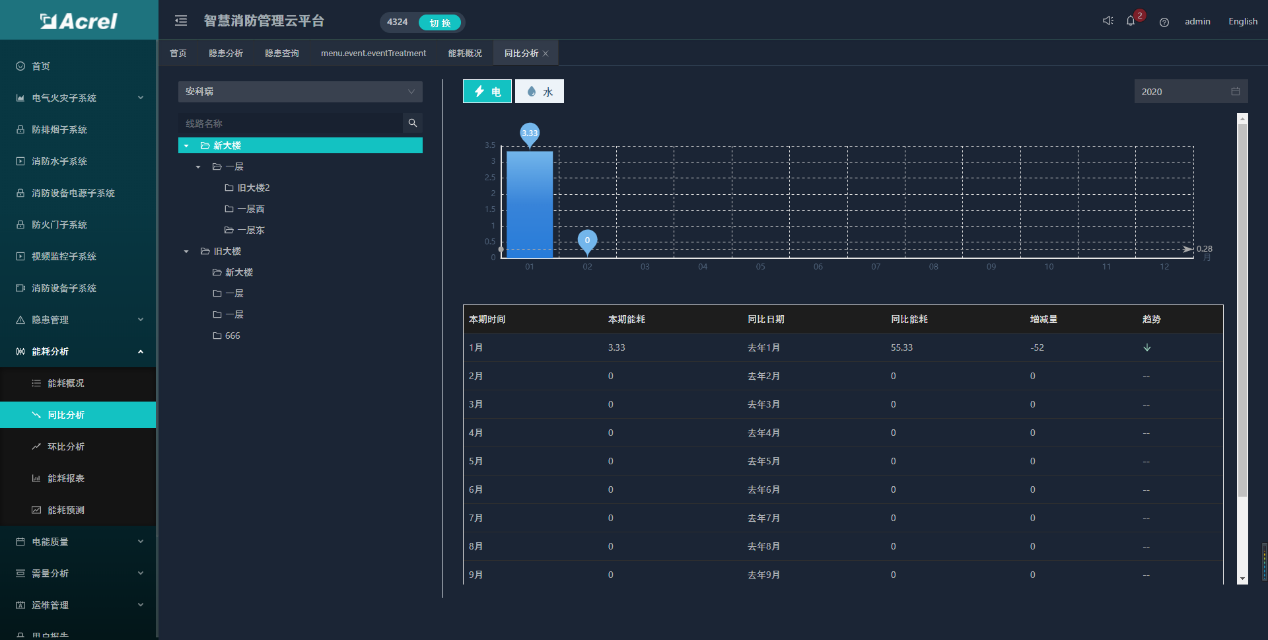 能耗分析功能包括了能耗概況、能耗同比、能耗環比、能耗報表和能耗預測等五個模塊。可以查看登錄用戶下的所有項目的能耗統計、同環比和報表,且按日、周、月等維度進行能耗預測分析。