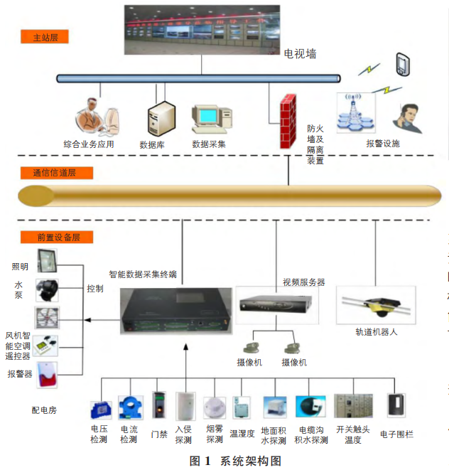 基于一體式子站系統(tǒng)的智能配電房監(jiān)控系統(tǒng)在結(jié)構上主要分為三層,分別為主站層、通信信道層以及采集設 備層,整個監(jiān)控系統(tǒng)通過這三層結(jié)構相互配合以實現(xiàn)對于 智能配電房各方面相關因素的全方位監(jiān)控。