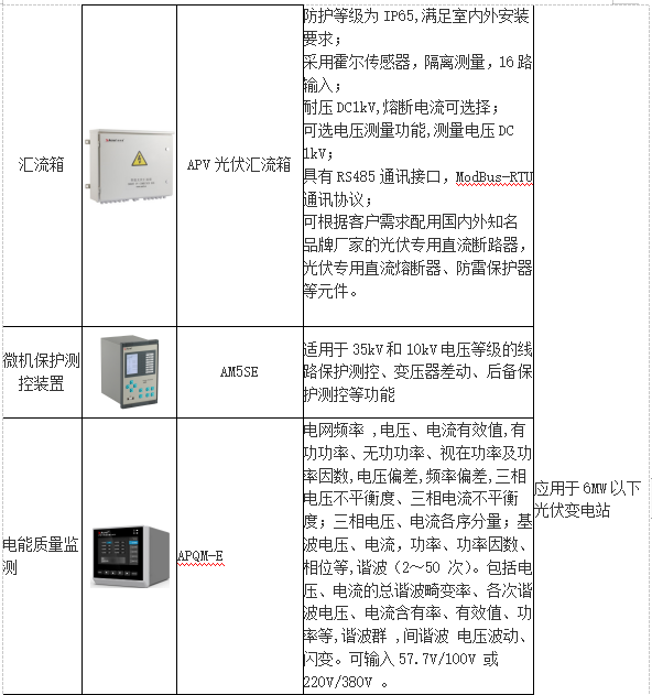 上圖為一個1MW分布式光伏電站的示意圖,光伏陣列接入光伏匯流箱,經過直流柜匯流后接入集中式逆變器(直流柜根據情況可不設置),經過升壓變壓器升壓至10kV或35kV后并入中壓電網。由于光伏電站裝機容量比較大,涉及到的保護和測控設備比較多,主要如下表: