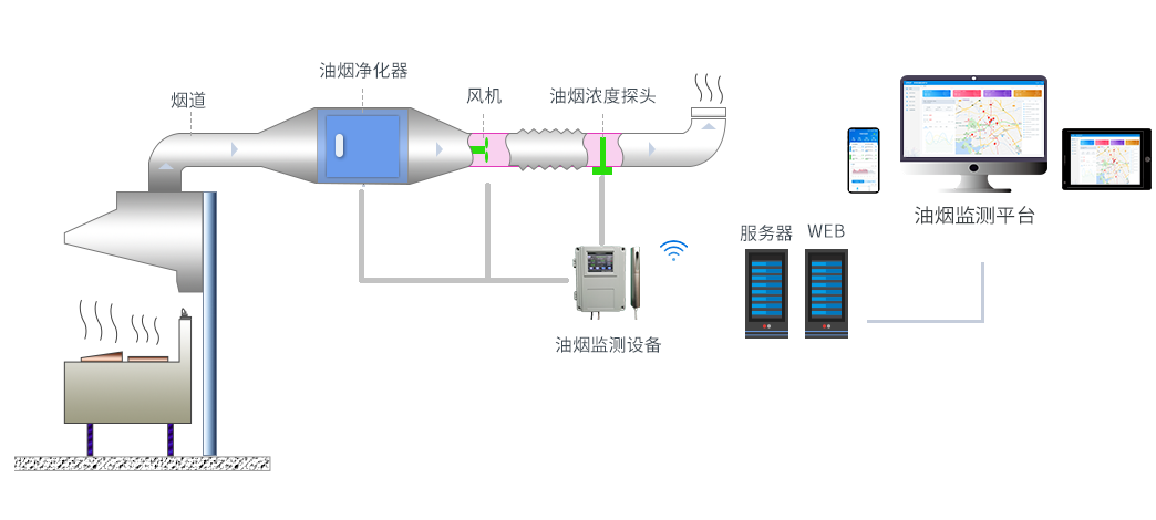 對油煙排污數(shù)據(jù)的監(jiān)測,包括油煙排放濃度,顆粒物,NmHc等數(shù)值采集監(jiān)測;同時對監(jiān)控風機和凈化器的啟停狀態(tài)、運行數(shù)據(jù)進行監(jiān)測。