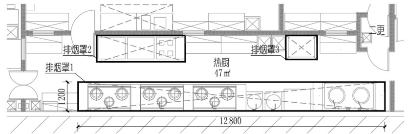 排油煙量計算案例如圖1所示。關(guān)于排煙罩排風量,技術(shù)資料給出了兩種計算方法,取大值,舉例計算排煙罩的排風量。