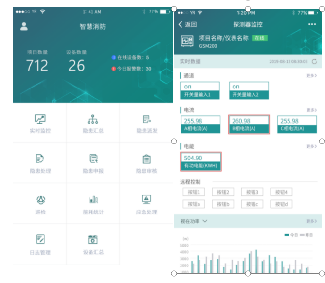 智慧消防管理云平臺包含了智慧用電子系統、防排煙子系統、消防水子系統、消防設備電源子系統、防火門子系統、消防設備管理子系統和視頻監控子系統等。智慧用電子系統可以接入電氣火災、孤航電弧、電氣火災主機、滅弧式保護器探測器和無線測溫探測器等。點擊智慧用電子系統進入智慧用電監控頁面,點擊菜單顯示整個項目的基礎信息和該項目下的所有探測器的信息,點擊末級節點顯示具體探測器的監控頁面。