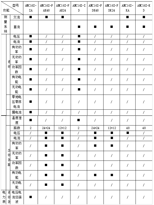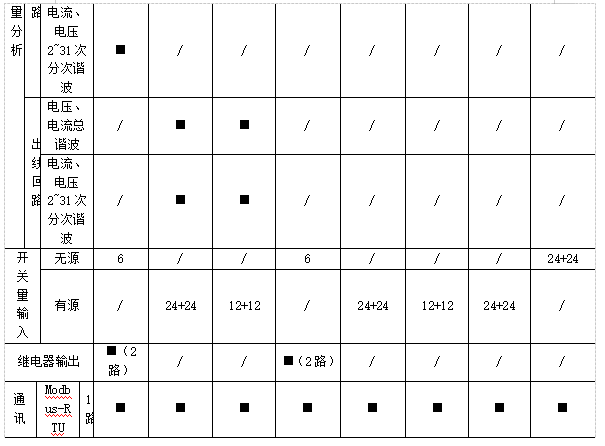 遙測:三相電壓、電流、有功功率、無功功率、視在功率、功率因數、有功電能、無功電能、電纜溫度,系統頻率、零序電流、零地電壓、漏電流、機柜溫度、機柜濕度、開關狀態、電壓/電流諧波含量、電流/功率;