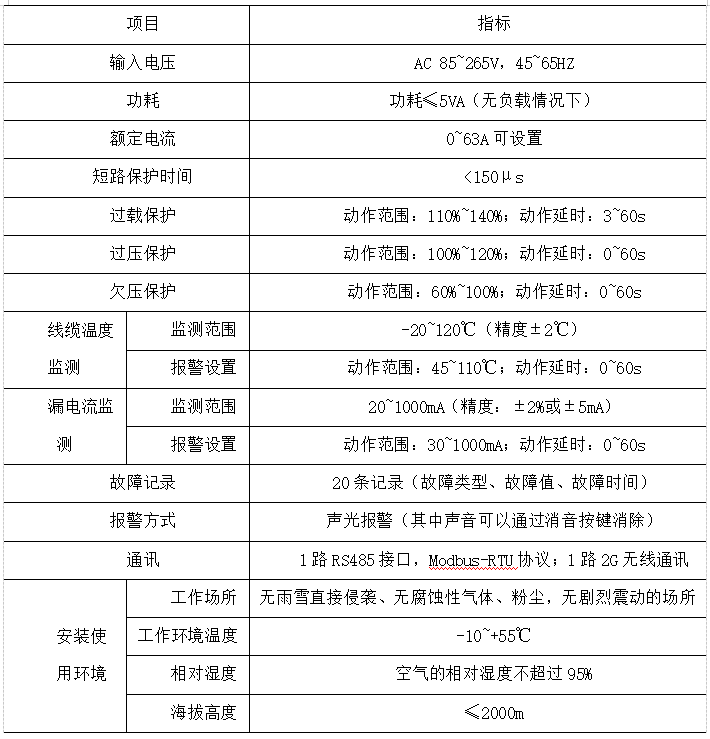 ■ 配電線纜溫度監測功能。當被監測線纜溫度超過報警設定值時,保護器發出聲光報警信號,可預先設置是否啟動限流保護。