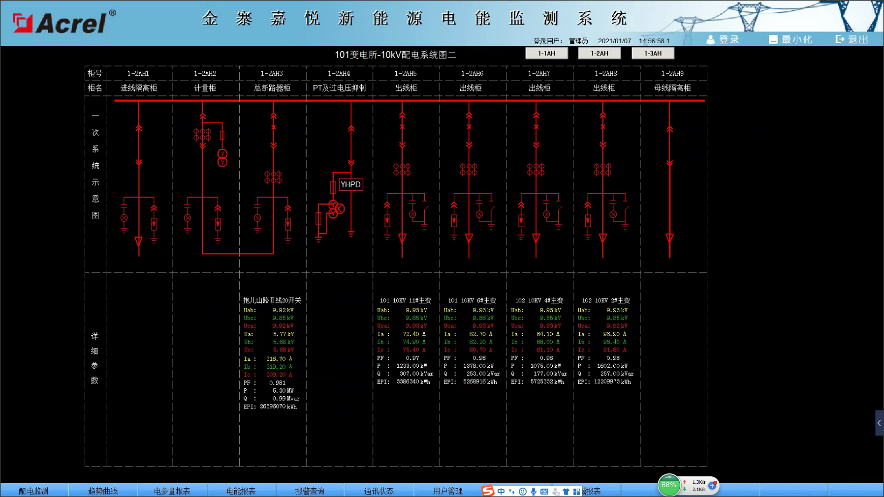 安科瑞Acrel-2000電力監控系統人機界面友好,能夠以配電一次圖的形式直觀顯示配電線路的運行狀態,實時監測各回路電壓、電流、功率、功率因數、電能等電參數信息,動態監視各配電回路斷路器、隔離開關、地刀等合、分狀態,以及有關故障、告警等信號。