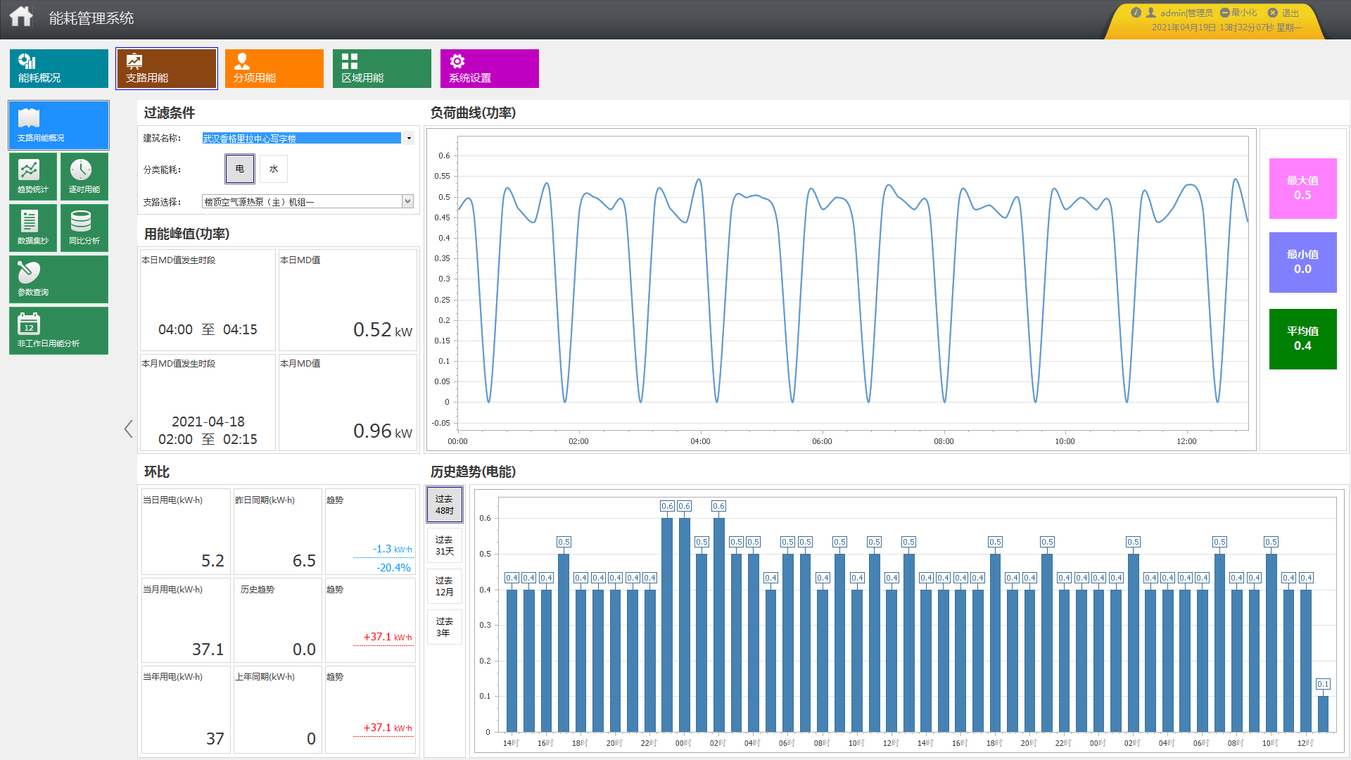 Acrel-5000能耗管理系統(tǒng)可以根據(jù)分類能耗的支路名稱查詢用能情況,顯示當(dāng)日和當(dāng)月的用能峰值(電能對(duì)應(yīng)大需量值)、當(dāng)日用能、當(dāng)月用能、當(dāng)年用能以及昨天同期用能、上月同期用能、上年同期用能的比較情況;以柱狀圖顯示過(guò)去48小時(shí)、31天、12個(gè)月、3年的能耗情況;以曲線圖顯示15分鐘的負(fù)荷用能走勢(shì)(電表顯示功率曲線,流量表顯示流速曲線),并顯示當(dāng)前值、15分鐘內(nèi)的大值和小值。