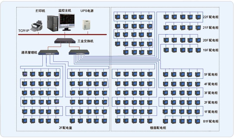 上海百樂(lè)門大酒店電力監(jiān)控系統(tǒng)監(jiān)控范圍為百樂(lè)門大酒店的22個(gè)樓層的PZ系列電力儀表和配電室的PZ、ACR系列電力儀表進(jìn)行遠(yuǎn)程監(jiān)測(cè)。現(xiàn)場(chǎng)設(shè)備全集中在同一個(gè)配電室中,業(yè)主的電氣值班室就近安排在配電室旁,本系統(tǒng)監(jiān)控中心也安置在該值班室中。系統(tǒng)組網(wǎng)采用常見的3層結(jié)構(gòu),站控管理層、通訊管理層和現(xiàn)場(chǎng)設(shè)備層。