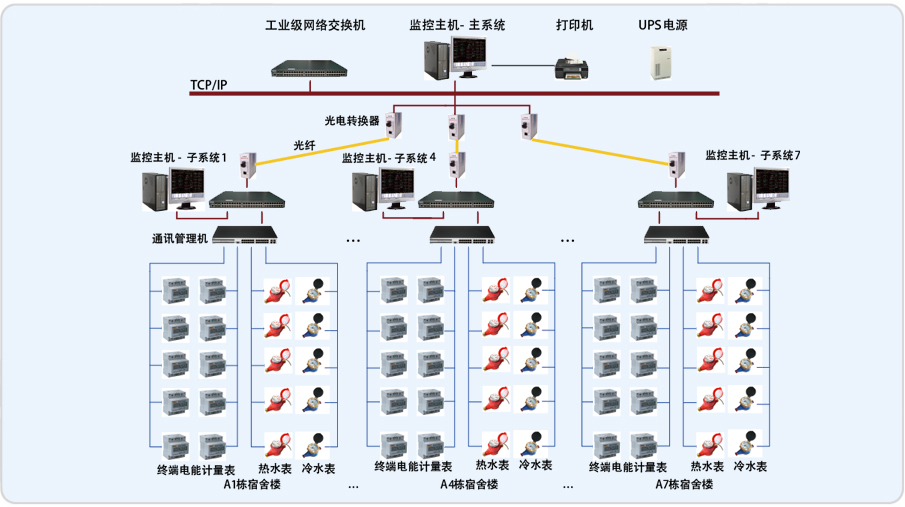 重慶廣達生活服務區能耗監測系統采用網絡分布式結構,整個系統包括該建筑群的七個子系統和中心監控室的一個總監控系統。冷/熱水表數據和電表數據當地采集完成后集中傳至中心監控室。 分控中心和中心監控室之間用光纖網絡進行通訊。每個子系統采用五臺通訊管理機,其中三臺通訊管理機采集樓內每戶的冷/熱水表數據,另外兩臺采集樓內電表的數據。