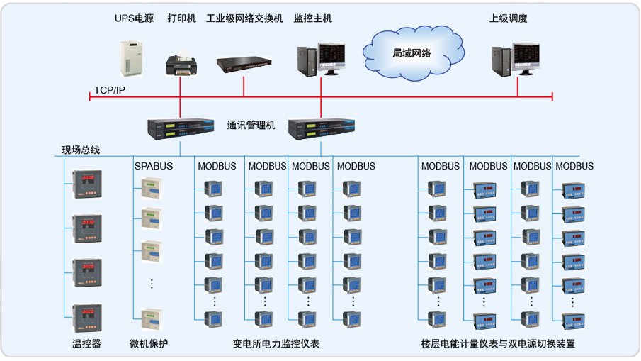 整個(gè)系統(tǒng)采用網(wǎng)絡(luò)分布式結(jié)構(gòu),監(jiān)控主機(jī)位于地下一層變電所值班室內(nèi),各變電所配電柜內(nèi)安裝有本公司ACR230ELH、ACR220EFLK儀表共計(jì)200多回 路。系統(tǒng)采用開放的通訊協(xié)議,通過現(xiàn)場(chǎng)總線與高低壓配電系統(tǒng)、變壓器溫控裝置、發(fā)電機(jī)的智能接口、ATSE及EPS等相連,實(shí)現(xiàn)數(shù)據(jù)通訊功能。同時(shí)監(jiān)視系統(tǒng)提供標(biāo)準(zhǔn)的RS485接口向上連接到BMS系統(tǒng)。