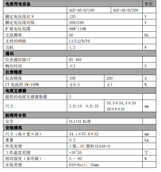 UL認(rèn)證應(yīng)用于分布式電源的逆變器、變流器、控制器標(biāo)準(zhǔn);光伏儲能單相防逆流電表,AGF-AE-D/200單相三線制,應(yīng)用于澳洲、歐洲、北美等海外地區(qū);電流規(guī)格200A,配套開口式互感器,安裝方便;通訊通訊采用RJ45的物理接口