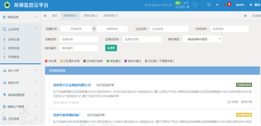 2.4.4企業運行狀態統計:按年/月/日統計分析企業、監測點、產污設施、治污設施等異常產生的情況。