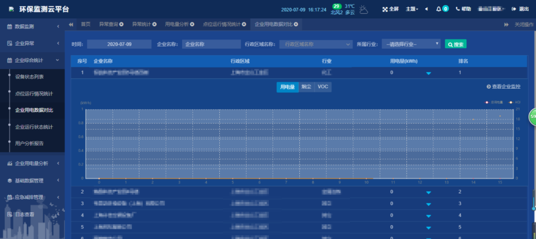 統計企業/行業在某個時間段內的產污數量,統計企業在污染日、非污染日的負荷對比,以小時為單位展示功率曲線,可查詢企業/行業的日功率曲線,默認是今日/昨日對比,可選擇對比的日期,統計企業/行業在某個時間段內的用電量,可按日/月/年進行統計和分析。