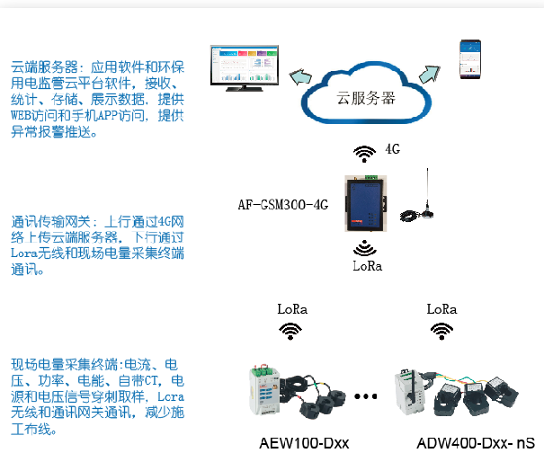 環保用電監管云平臺包含站控管理層(軟件平臺)及網絡通訊層(通訊傳輸網關),現場安裝無線計量裝置(ADW400系列)。
