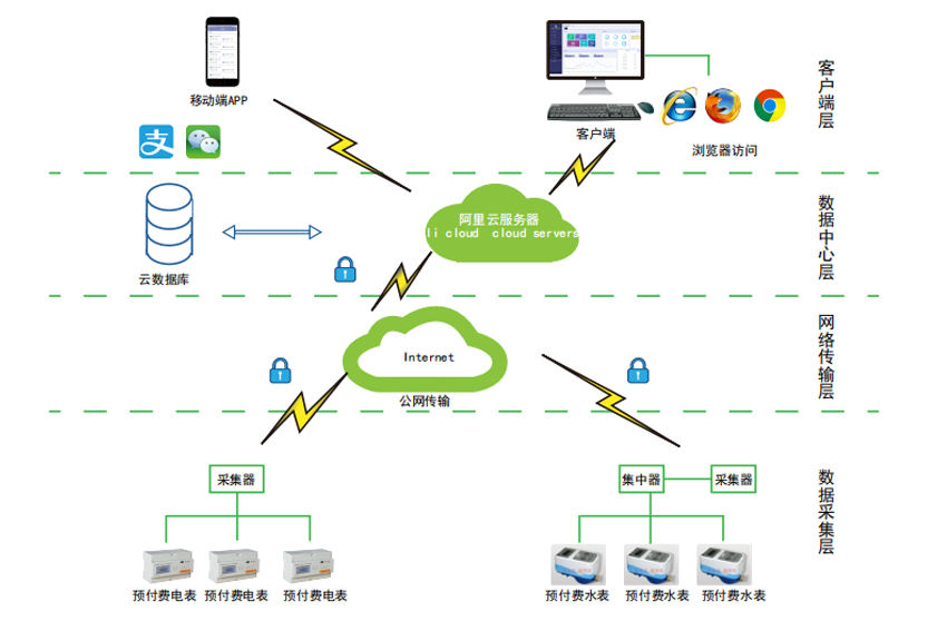 安科瑞遠程預付費管控系統(AcrelCloud-3200)無縫集成商業、物業公司、集團企業、院校等分散布置的安科瑞DDSY/ADF系列電子式預付費電能表、閥控智能水表等,提供微信、支付寶、銀聯等可選的在線支付方式,大大方便了用戶充值、圈存,提供預警和充值、退費、電能消耗等記錄查詢,方便用戶和管理方的數據統計和財務分析,提供先交費后使用的管控機制,大大降低了管理部門的收費成本。