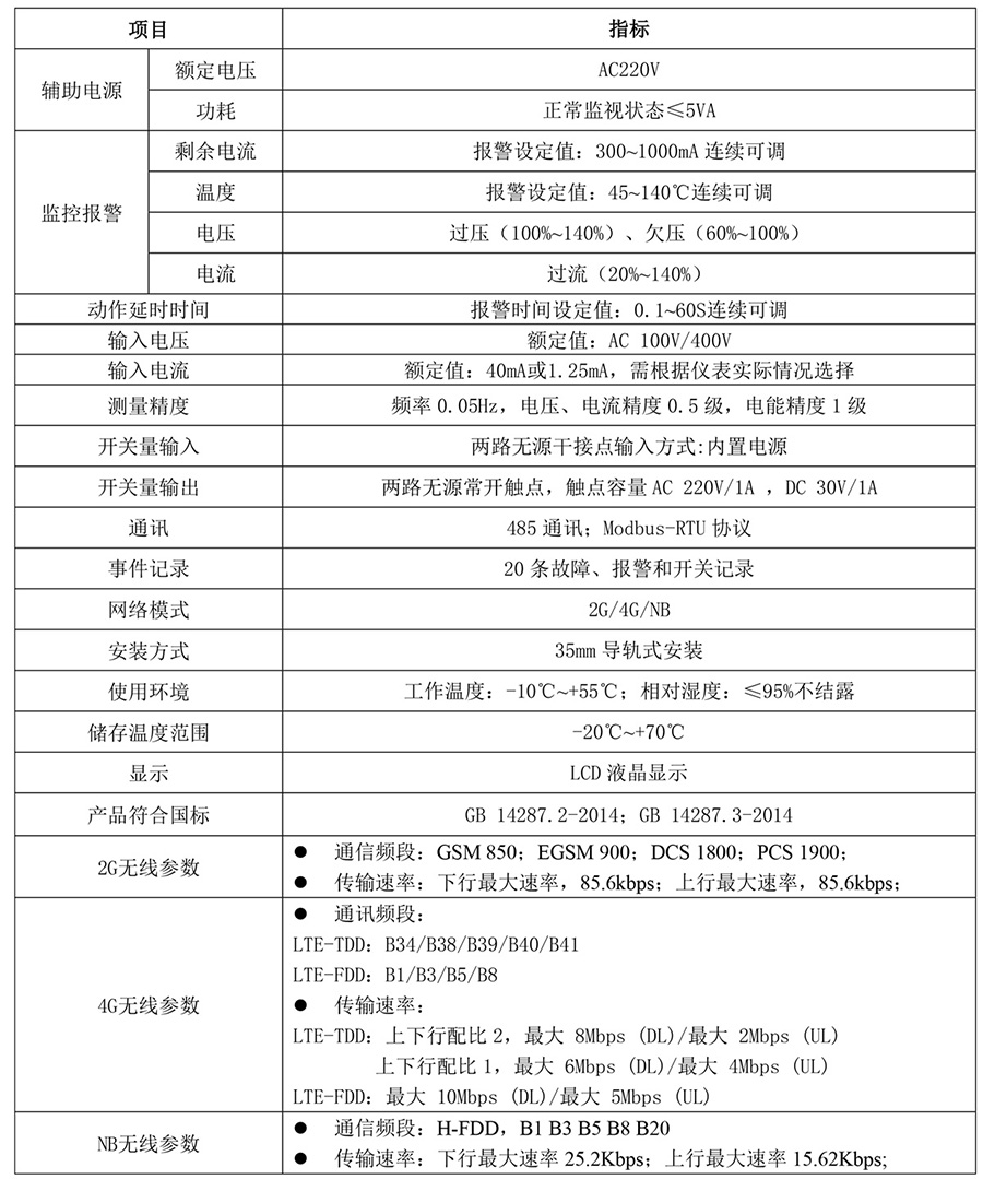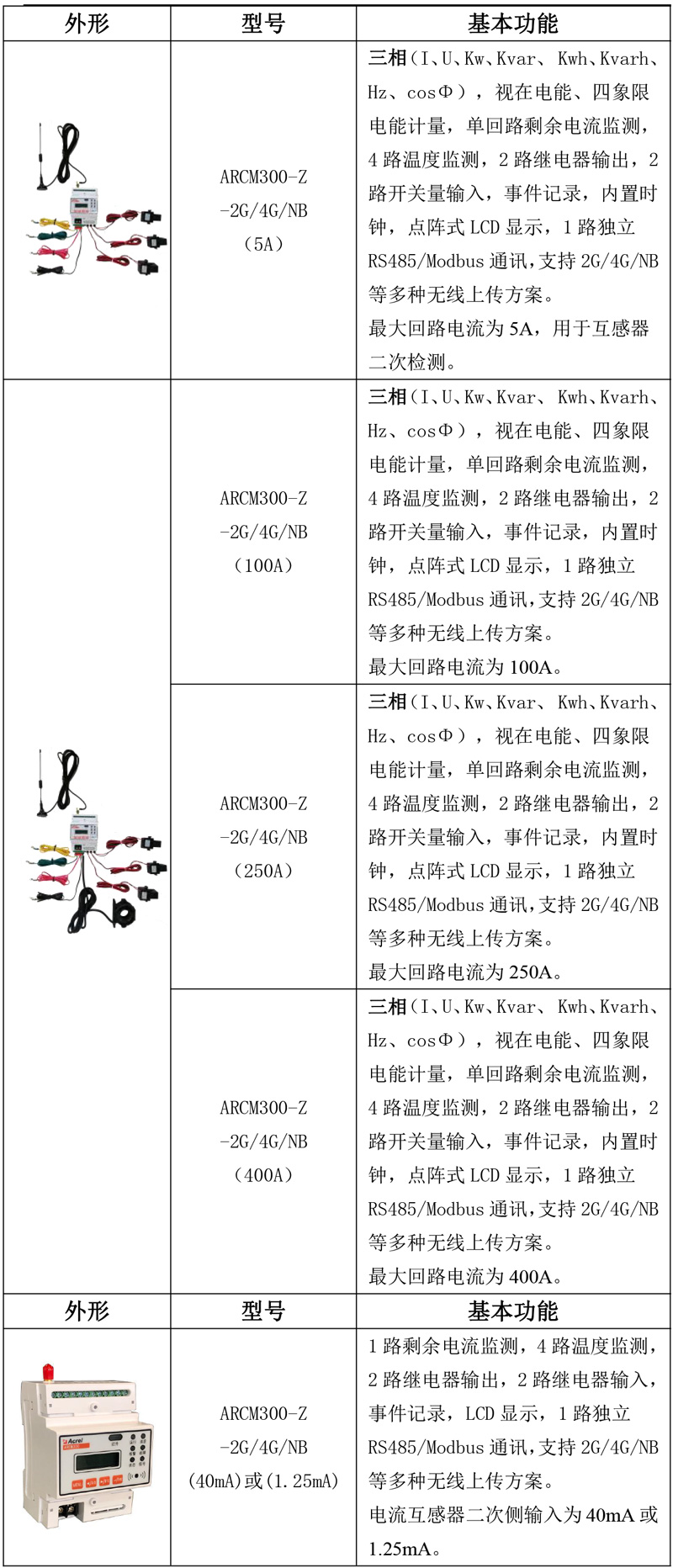 測溫式電氣火災(zāi)監(jiān)控探測器ARCM300-Z-4G(100A);三相(I、U、Kw、Kvar、 Kwh、Kvarh、Hz、cosΦ),視在電能、四象限電能計(jì)量,單回路剩余電流監(jiān)測,4路溫度監(jiān)測,2路繼電器輸出,2路開關(guān)量輸入,事件記錄,內(nèi)置時(shí)鐘,點(diǎn)陣式LCD顯示,1路獨(dú)立RS485/Modbus通訊,支持4G。大回路電流為100A。